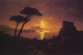 My novel in progress begins in Naples around 1900, in a palazzo on the bay. So I’m looking at images of the time and found this by Ivan Aivazovsky, an astonishingly prolific Armenian landscape painter who lived from 1817-1900. In my years in Naples I never saw quite such a sunset, but it doesn’t matter. The Tahitian sky, the romance of ruined castle, the plane trees leaning, the sun-fires on Vesuvius, sail boats skimming the silky sea, they’re all things to dream on. And those dimly seen people in the foreground, what’s their story?