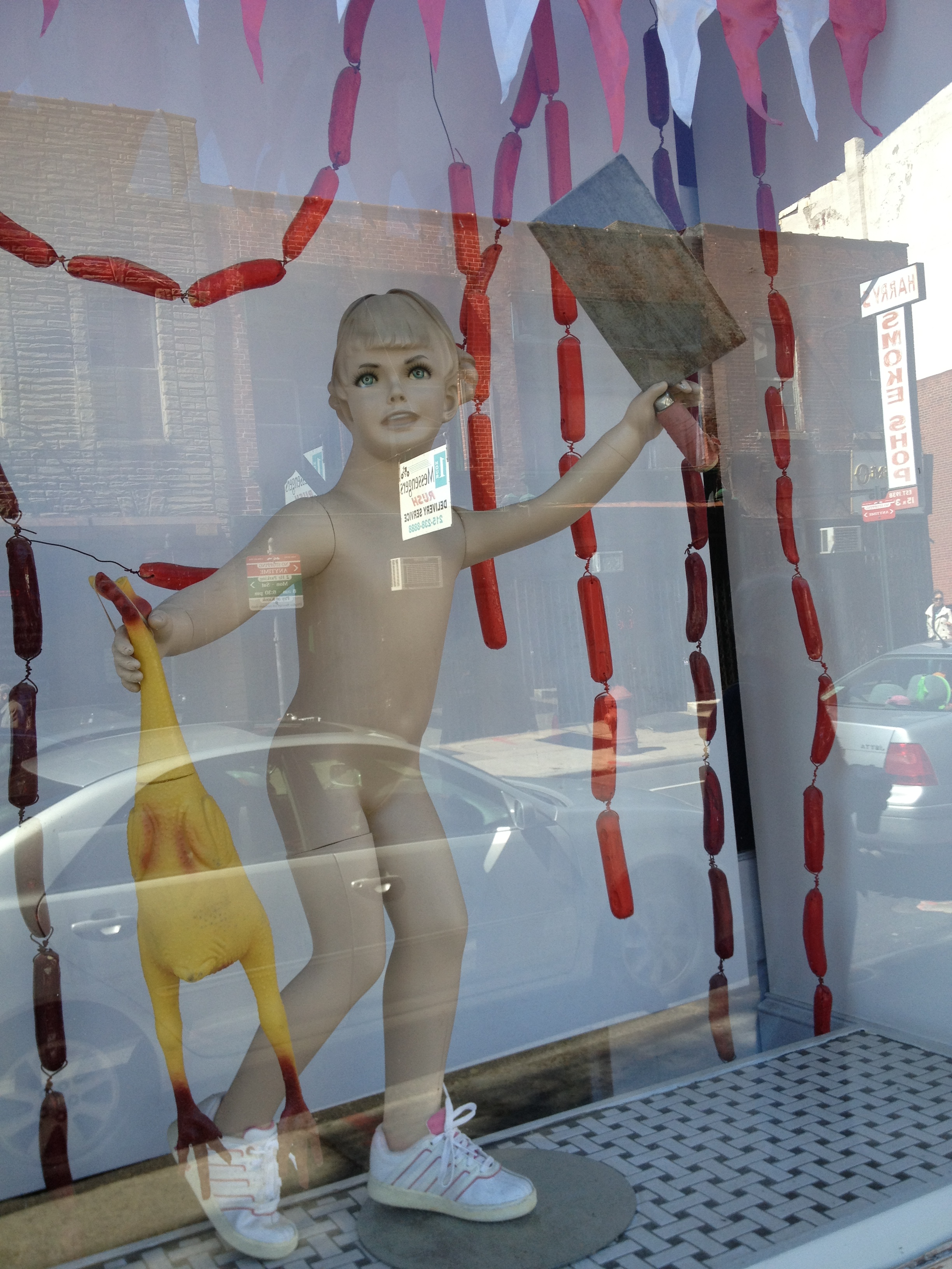 I went to graduate schools in Philadelphia (U of Penn in English literature and Temple U for radio-TV-film) and since my sister lives there, I return often. It’s a wonderful city, beautiful, wildly diverse neighborhoods, plenty of that history and culture stuff, affordable, and it’s got an essential weirdness that is just so great. Here are some examples. I will trust astute readers to match captions with the image: 1) a self-portrait in the Magic Garden on South Street, a wonderland of glass and found objects; 2) interior of the Garden; 3) shop window display on, maybe N. 3rd, promoting I don’t know what; 4) winter protection of a lamp post by a thoughtful Philadelphia citizen.