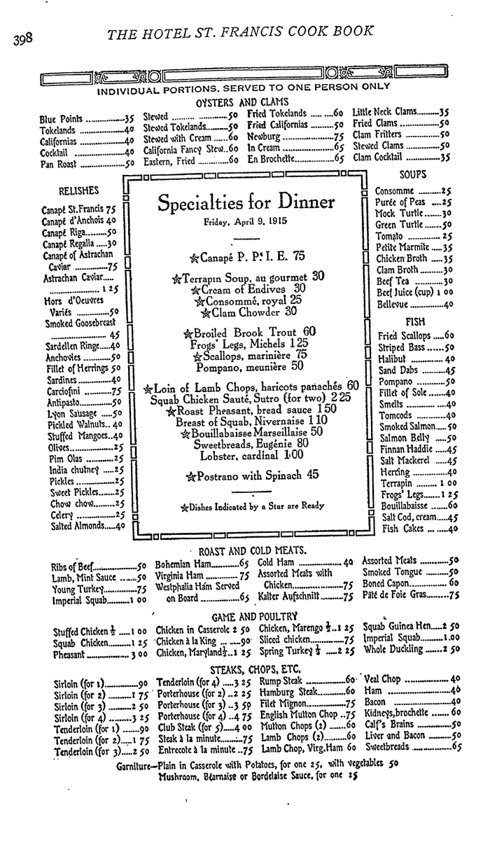 During World War I, the time frame of Under the Same Blue Sky, here’s what you’d find at San Francisco’s Hotel St. Francis. Notice: quite a lot of shellfish, not much meat, chicken cost less than lobster, and one dessert. Prices are good, though.